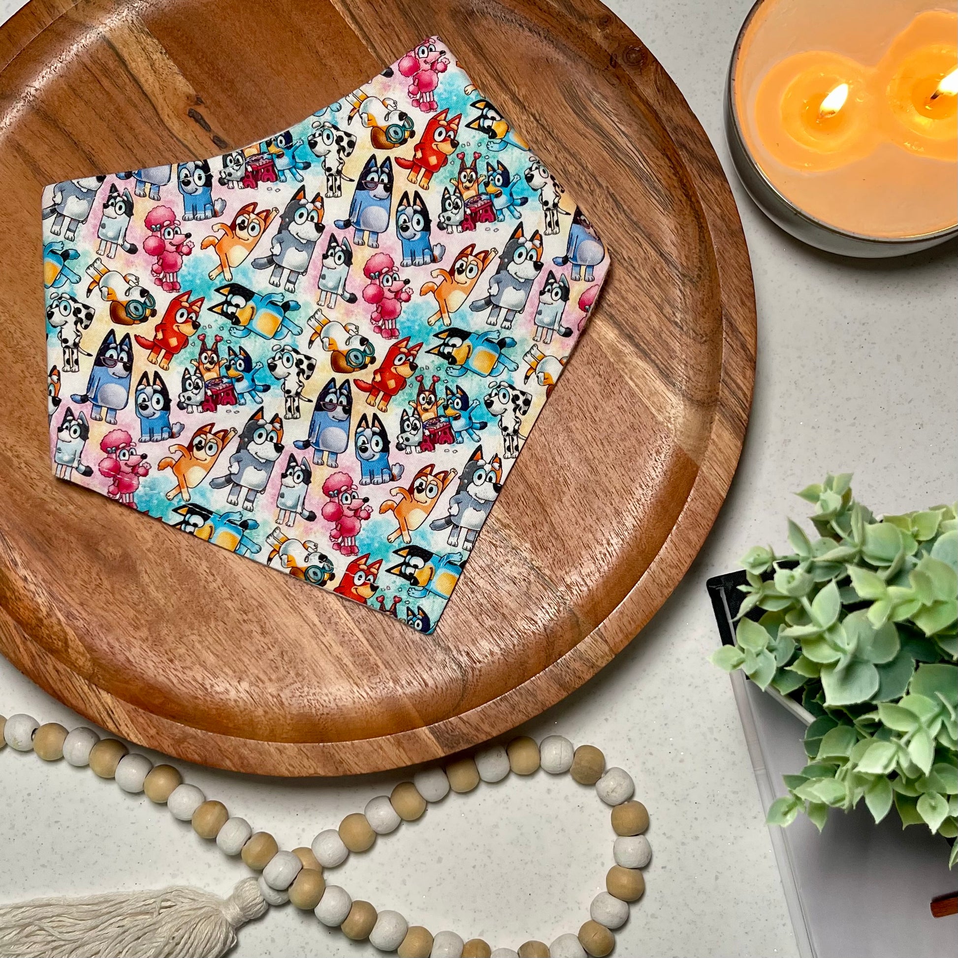 A beautifully constructed high quality dog bandana: great for stylish pups and made right here at The Corgi Cookie Co.! These bandanas are 100% cotton fabric/flannel, backed with white flannel and equipped with four coordinating plastic snaps on each size for an adjustable fit. The flannel backing helps the bandana keep its shape and holds up better in the wash than other bandanas!