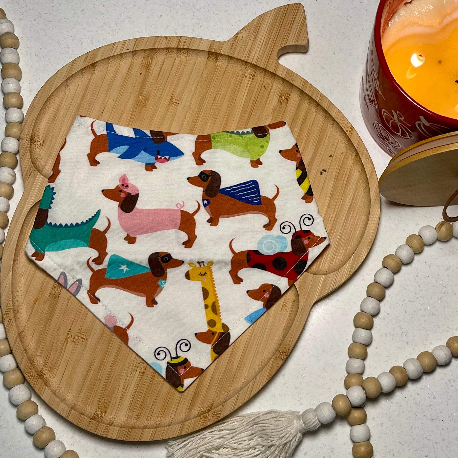 A beautifully constructed high quality dog bandana: great for stylish pups and made right here at The Corgi Cookie Co.! These bandanas are 100% cotton fabric/flannel, backed with white flannel and equipped with four coordinating plastic snaps on each size for an adjustable fit. The flannel backing helps the bandana keep its shape and holds up better in the wash than other bandanas!